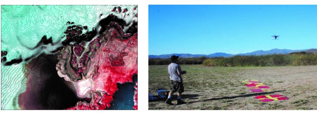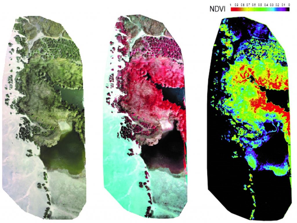 Entre los productos que generamos se incluye las imágenes multiespectrales, que son más ricas en información que las imágenes convencionales debido a que permiten identificar propiedades biofísicas de la cubierta del terreno, por ejemplo cuerpos de agua, tipos de vegetación y suelo.